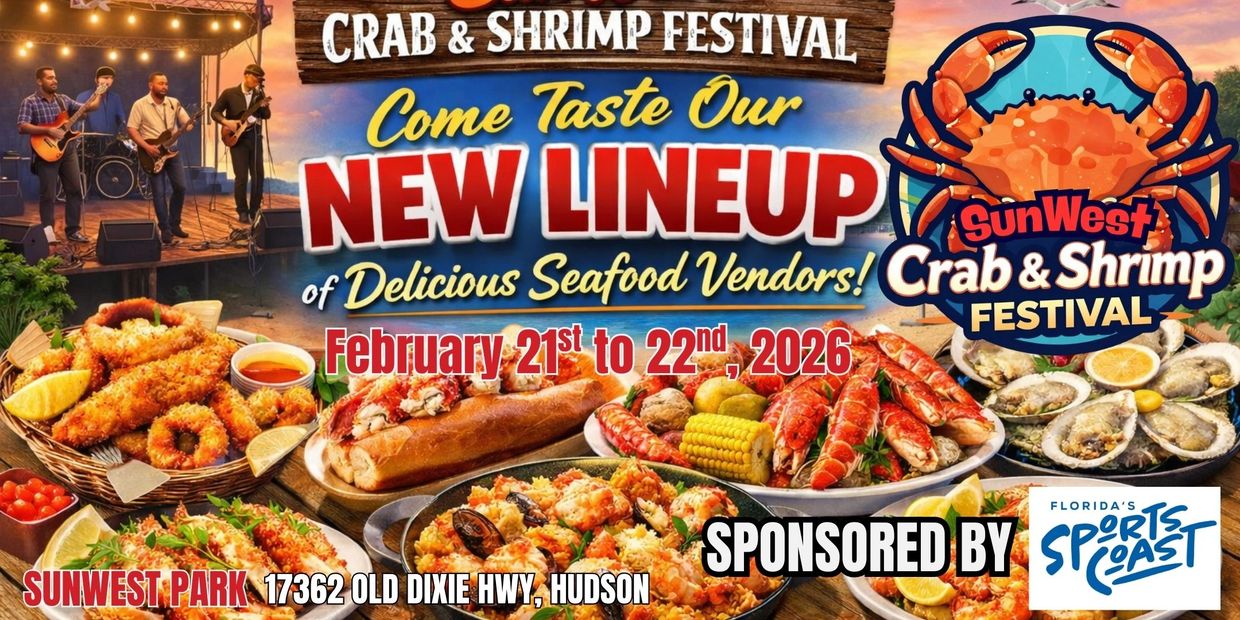 Its the huge SunWest Crab & Shrimp Fest happening at the beautifully renovated SunWest Park! This is our premier Spring event. Contact drew@floridapenguinproductions.com or call 727-510-9343 for any questions or click the link below to sign up online.